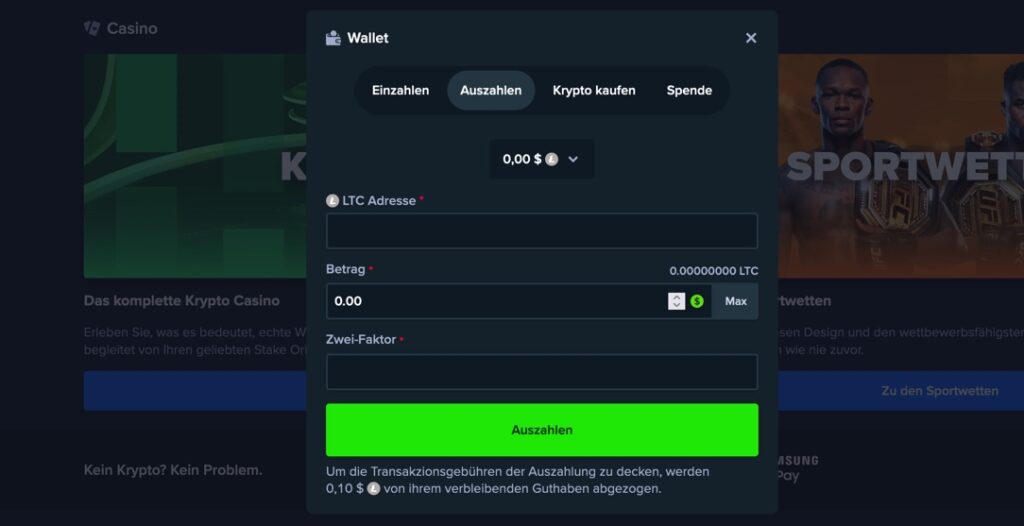 Es gibt sicherlich tausende Kryptowährungen, welche diese Eigenschaften mitbringen, allerdings steht auch nur eine gewisse Auswahl im Casino zur Verfügung. Ich persönlich bevorzuge immer den Litecoin (LTC). Dieser Coin hat sehr niedrige Transaktionsgebühren, so dass ich meist nur wenige Cent für den Versand bezahle und weiterhin ist er innerhalb von 2-5 Minuten auf meinem Stake-Account gutgeschrieben.