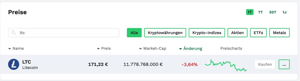 Ich führe euch durch den Vorgang und zeige wie Ihr meine empfohlene Währung „LTC (Litecoin)“ kaufen könnt. Dieser Prozess ist bei Bitpanda sehr leicht und einfach durchzuführen. Ganz oben in deinem Dashboard findest du diverse Assets. Rechts oben steht “Alle Assets anzeigen” – nun findest du eine Liste aller möglichen Käufe. Gib in die Suchleiste “LTC” ein und Litecoin wird dir als einziger Asset angezeigt. Rechts neben dem Wert kannst du nun durch den Button “kaufen” eine beliebige Summe LTC mit deinem verfügbaren Guthaben erwerben.